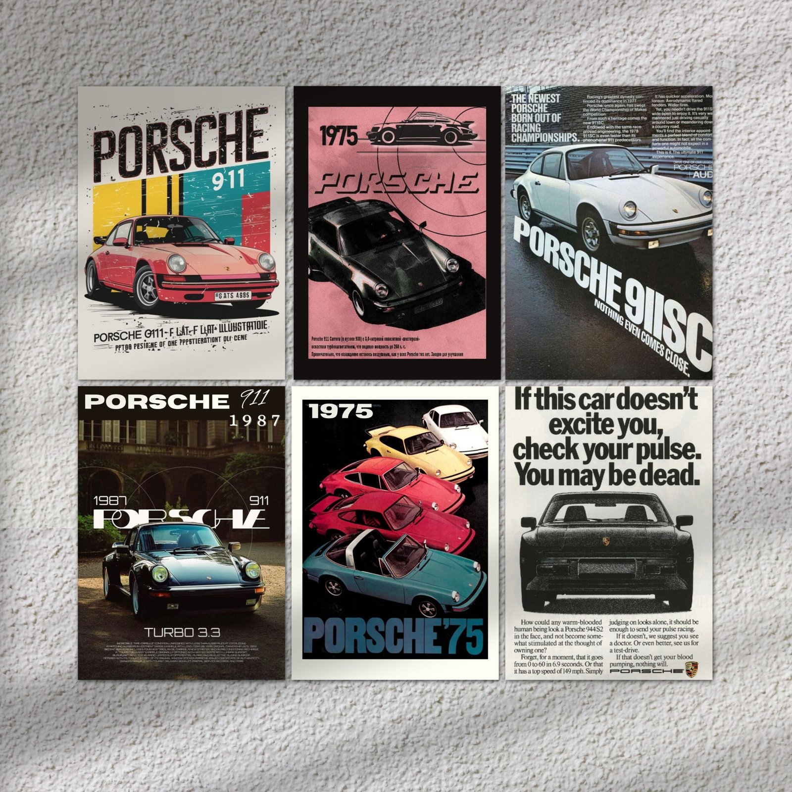 Set of 12 Porsche car posters featuring classic and modern models.