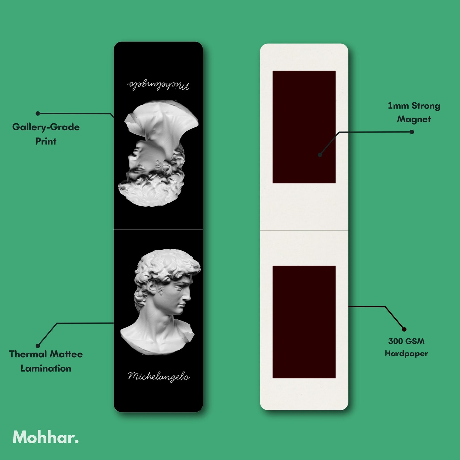 Printed on 300 GSM premium hard paper with thermal matt lamination, these bookmarks are built to last, resisting wear and ensuring smooth handling. The 1.5mm strong magnet securely clips to your page without damaging your book, making it a practical yet artistic accessory.