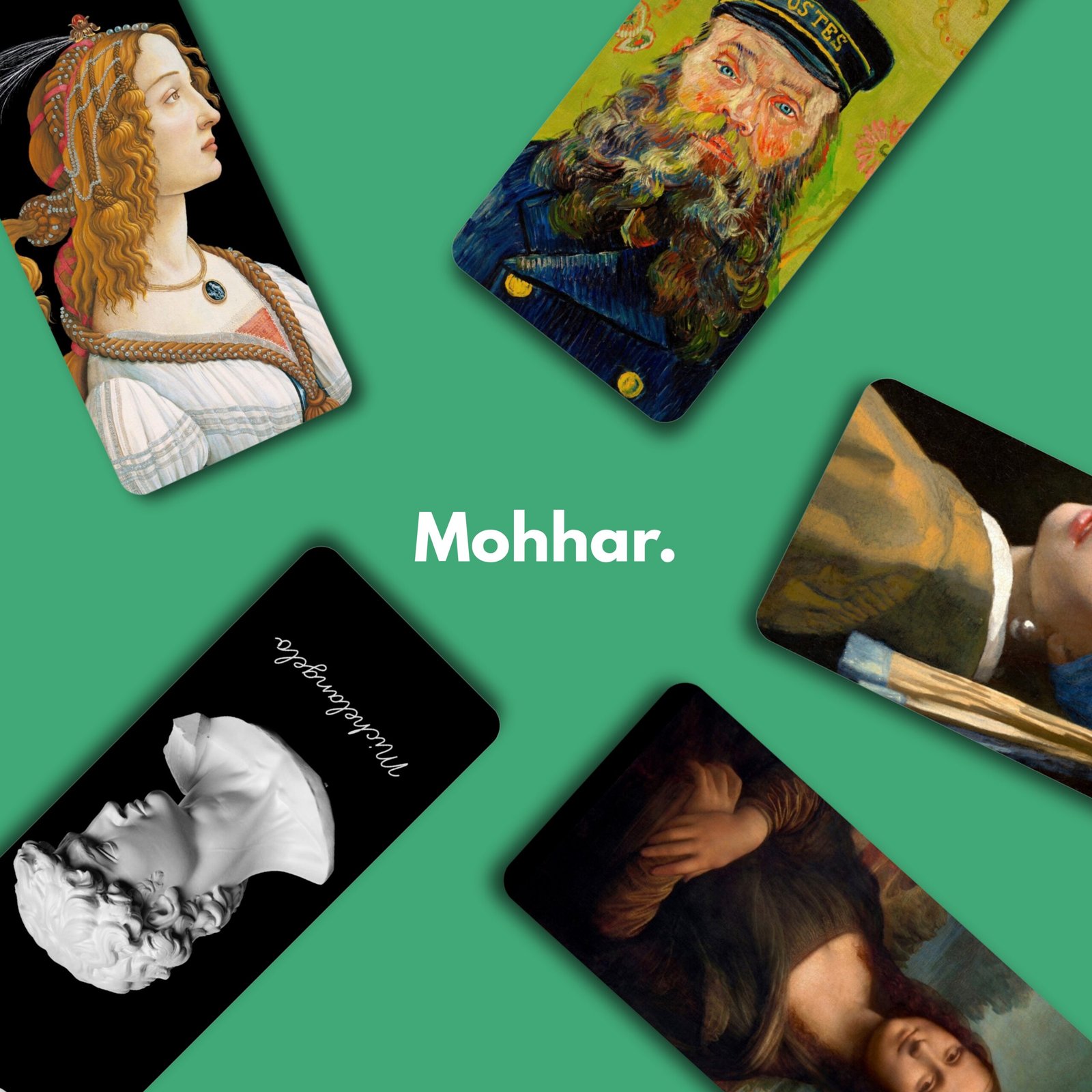 Includes Vermeer’s Girl with a Pearl Earring, da Vinci’s Mona Lisa, Botticelli’s Lady, Michelangelo’s David, and Van Gogh’s Postman.